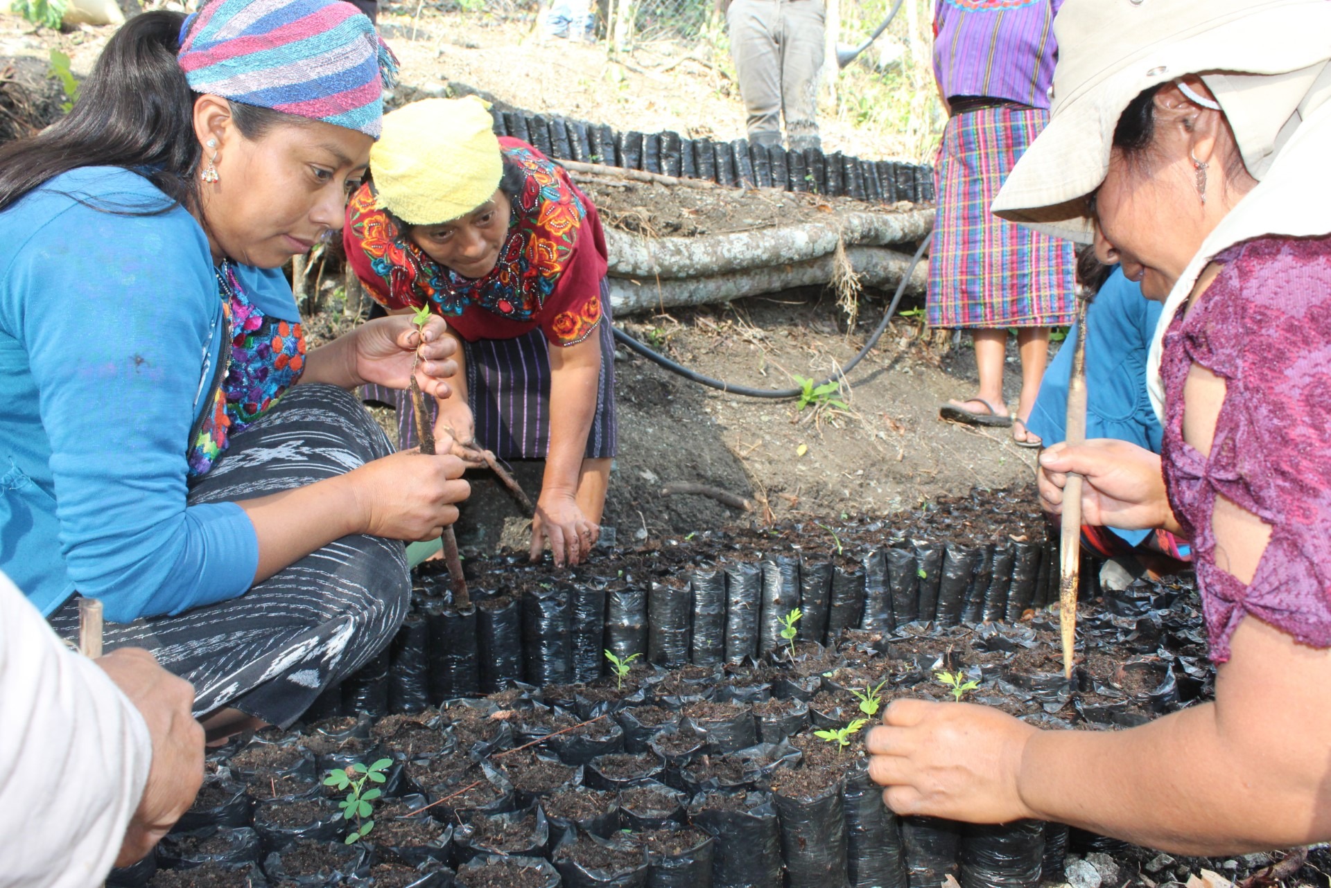 Photo: (Right) Members of the village of Chivaquito are planting seeds of several varieties of native trees in a seed bed they have prepared. Note that the seed bed is near water so that in the dry season it can be watered. (Below) Women of the group transplant the seedlings from the seedbed into individual grow bags.